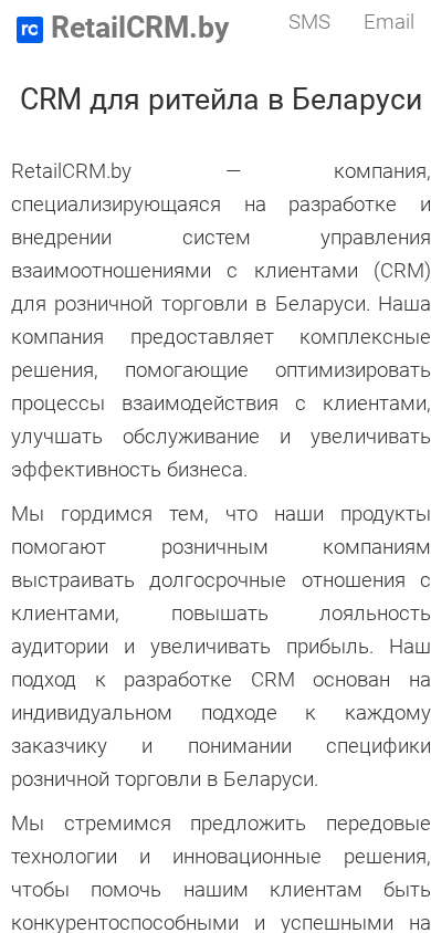 SEO-описание | RetailCRM.by — компания, специализирующаяся на разработке и внедрении систем управления взаимоотношениями с клиентами (CRM) для розничной торговли в Беларуси. |