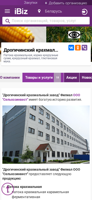Название / Заголовок | Дрогичинский крахмальный завод Филиал ООО Сельхозинвест - Патока крахмальная, корма кукурузные сухие, кукурузный крахмал, глютеновая мука. . 225612, Дрогичин, , Ленина, 204 |