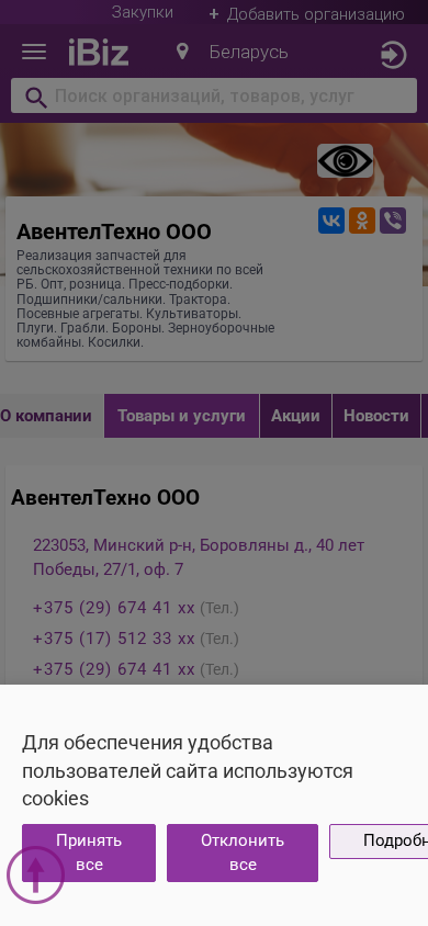 Название / Заголовок | АвентелТехно ООО - Реализация запчастей для сельскохозяйственной техники по всей РБ. Опт, розница. Пресс-подборки. Подшипники/сальники. Трактора. Посевные агрегаты. Культиваторы. Плуги. Грабли. Бороны. Зерноуборочные комбайны. Косилки.. 223053, , Боровляны д., 40 лет Победы, 27/1, оф. 7 |