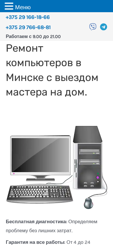 | SEO-описание | Компьютер сломался? Ремонт в Минске на дому. Бесплатная диагностика, цены от 20 руб. Гарантия 12 мес. |