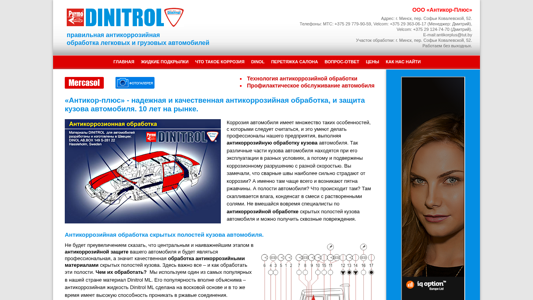 | AI-анализ | This website is for "УП Антикор-Плюс," a corporation specializing in anti-corrosion treatment for cars in Minsk, Belarus. The company offers anti-corrosion treatment for both passenger and cargo vehicles, focusing on the protection of car bodies, including their undercarriages and door thresholds. The website mentions the use of Dinitrol-Termo and Dinol materials for their treatments. The company has been in business for over ten years and has phone numbers and an email address for customer inquiries. The main service offered is the application of liquid undercoating for corrosion prevention. The website includes a FAQ section and a prices page. The company appears to provide preventative vehicle maintenance by treating hidden areas of the car body to prevent corrosion and potential damage. They use Dinitrol ML as one of their materials for these treatments. |