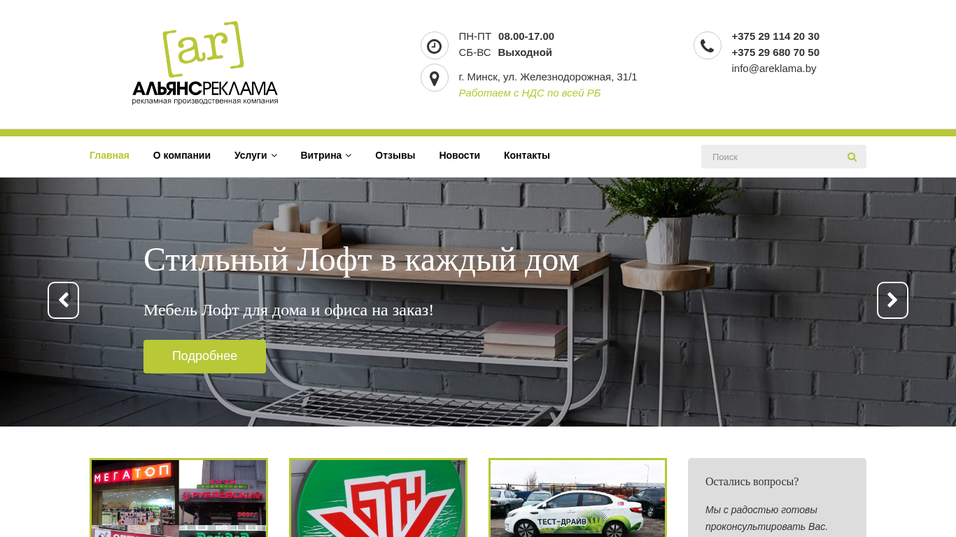 | AI-анализ | --- This online resource, Alliance-Advertising.by, specializes in the production and installation of outdoor advertising and signage, as well as the development of design prototypes. The website offers various types of indoor advertising signs, store signs, light boxes, and three-dimensional signs. The title of the website is "Альянс-Реклама" and the keywords include "реклама" (advertising), "вывески" (signs), "стенды" (stands), and "areklama" (advertising in Belarusian). The top search terms leading to the website are "375" (Belarus country code), "печать" (printing), and "подробнее" (more details). The website uses Google Analytics and has the URL domain areklama.by. |