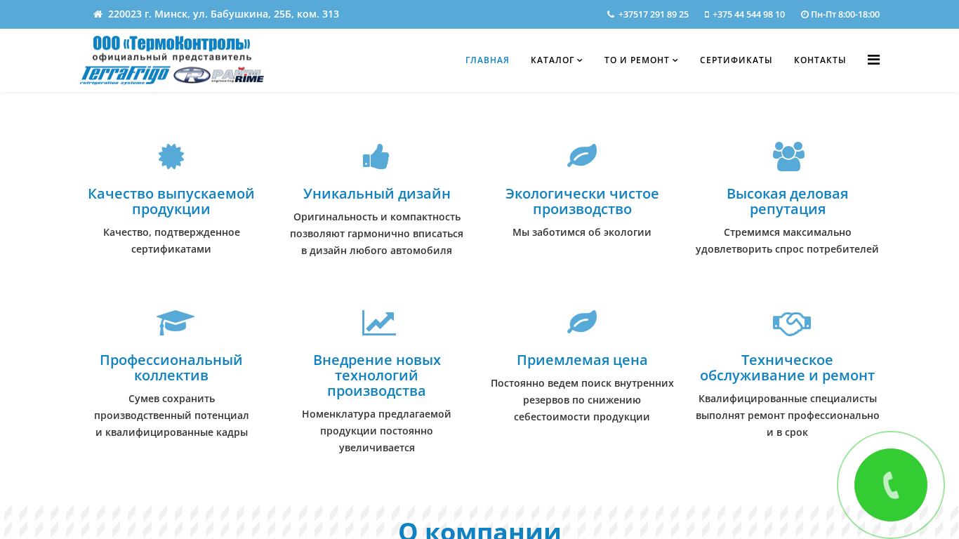 | SEO-описание | ООО ТермоКонтроль официальный представитель компании ТеrraFrigo производителя транспортных холодильных и холодильно-обогревательных установок, автокондиционеров, холодильно-отопительного оборудования для автомобилей, легкого коммерческого транспорта, грузовиков и полуприцепов. |