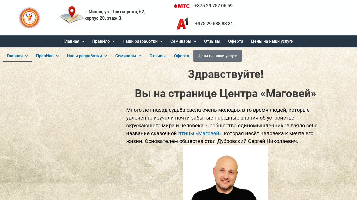 | AI-анализ | The website Magovey is a health and sports club offering various services including Rule of Three training, boxing, kickboxing, system Cadocnikov, and gravitational gymnastics, with a sports hall. The name of the club is 'Маговей'. The club is located in Minsk, Belarus, and provides training and massage services. The website includes a search function, and is part of the Magovey organization. The organization logo is a rectangular image with the dimensions 1280 pixels by 342 pixels. The most frequently used words on the website are 'маговей' (9 occurrences), 'наши' (9 occurrences), 'правило' (8 occurrences), 'тренаж' (7 occurrences), and '375' (4 occurrences). The website also mentions 'веники |
