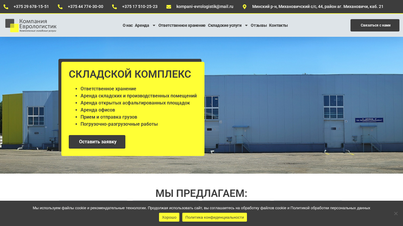 | SEO-описание | Складской комплекс "Еврологистик" ★ Предлагаем услуги по складскому хранению вашего товара по доступным ценам ★ Сотни довольных клиентов ★ Чисты и аакуратные склады ☎ +375 29 678-15-51 |