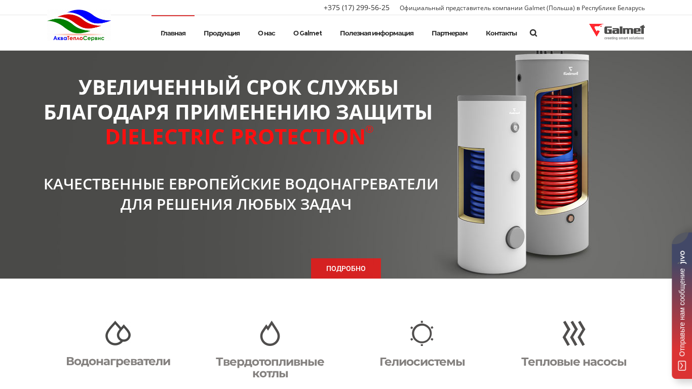 | SEO-описание | ООО Акватеплосервис - официальный представитель GALMET (Польша) в РБ. Полный ассортимент водонагревательной техники от водонагревателей до гелиосистем. |