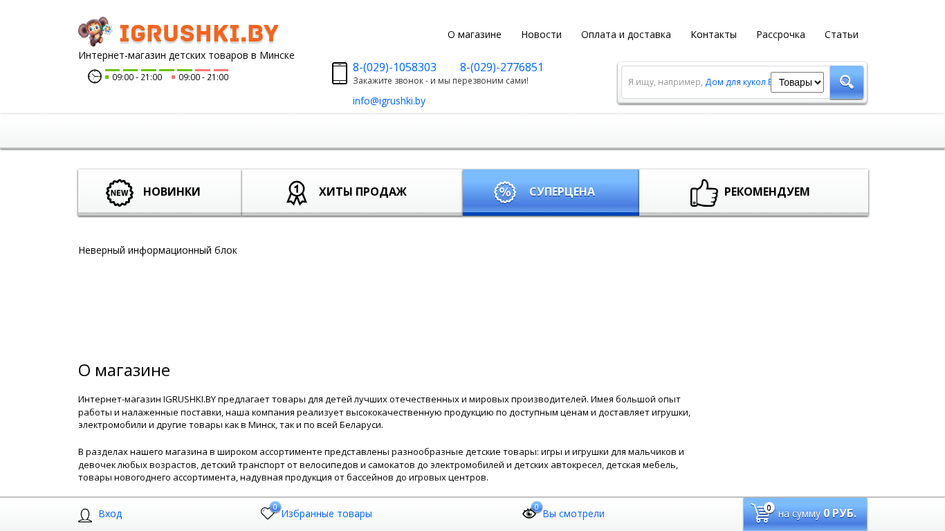 | AI-анализ | --- The portal Igrushki.by offers children's goods from leading domestic and international manufacturers. With a wealth of experience and streamlined supply chains, our company sells high-quality products at affordable prices and delivers toys, electric vehicles, and other items to both Minsk and throughout Belarus. In the store's sections, you will find a vast array of children's products: games and toys for boys and girls of all ages, children's transportation ranging from bicycles and scooters to electric vehicles and child seats, children's furniture, New Year's items, inflatable products from pools to play centers, and more. You can consult our team by calling our phone numbers for product information, delivery conditions, and more. |