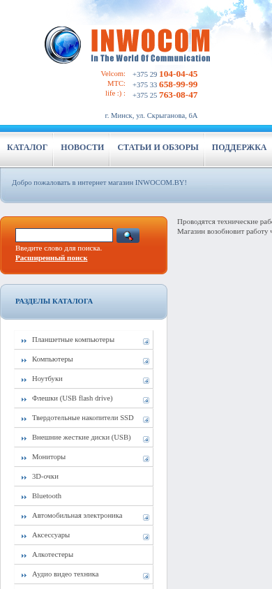 | AI-анализ | The portal is a computer store based in Minsk, Belarus, with phone numbers +375 29 104-04-45, +375 33 658-99-99, and +375 25 763-08-47. It offers a wide range of computer hardware and software, including CPUs from AMD and Intel, computer memory, USB and socket cables, Wi-Fi accessories, and various models of laptops, monitors, and other computing devices. The store also provides services such as support, delivery, and payment options including credit. The website includes sections for new arrivals, popular items, articles and reviews, and a price list. Brands and manufacturers are listed, and customers can contact the store for information. The website is INWOCOM.BY. |