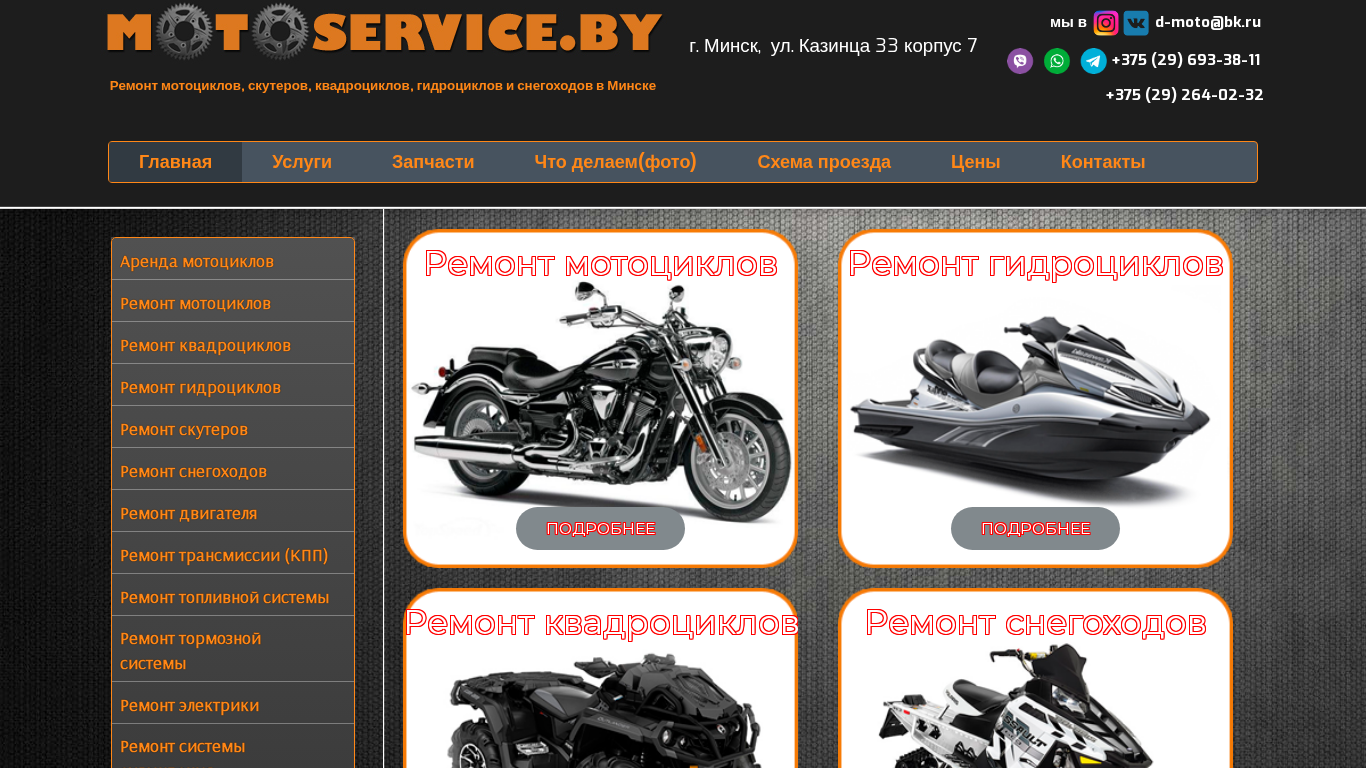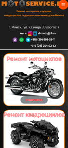 | SEO-описание | Специализированный сервис по ремонту мотоциклов в Минске, а так же скутеров, квадроциклов и гидроциклов. |