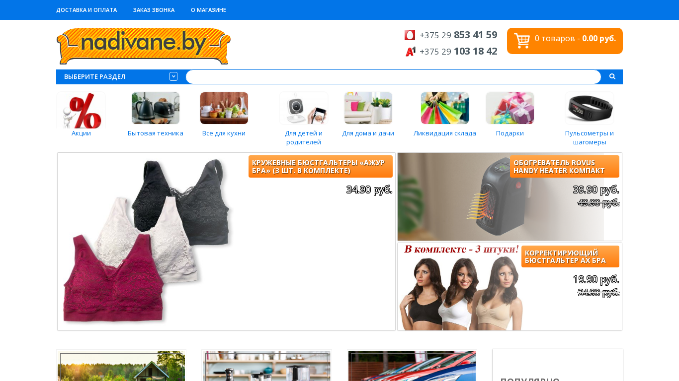 | AI-анализ | The portal Nadivane.by is an online shopping mall offering delivery throughout Minsk and Belarus. The range of products includes home appliances, health and wellness items, personal care, kitchenware, electronics, automobile accessories, and more. Prices are low, and regular promotions are available. The site includes sections for new arrivals, clearance sales, and gift ideas for men and women. The shopping cart and payment information are located at the top of the page, along with links for order formation and product search. The site offers delivery and payment options, as well as customer support by phone. Categories include health and fitness equipment, massage chairs, skin care, weight loss products, and household items. The site is available in Belarusian and Russian languages. |