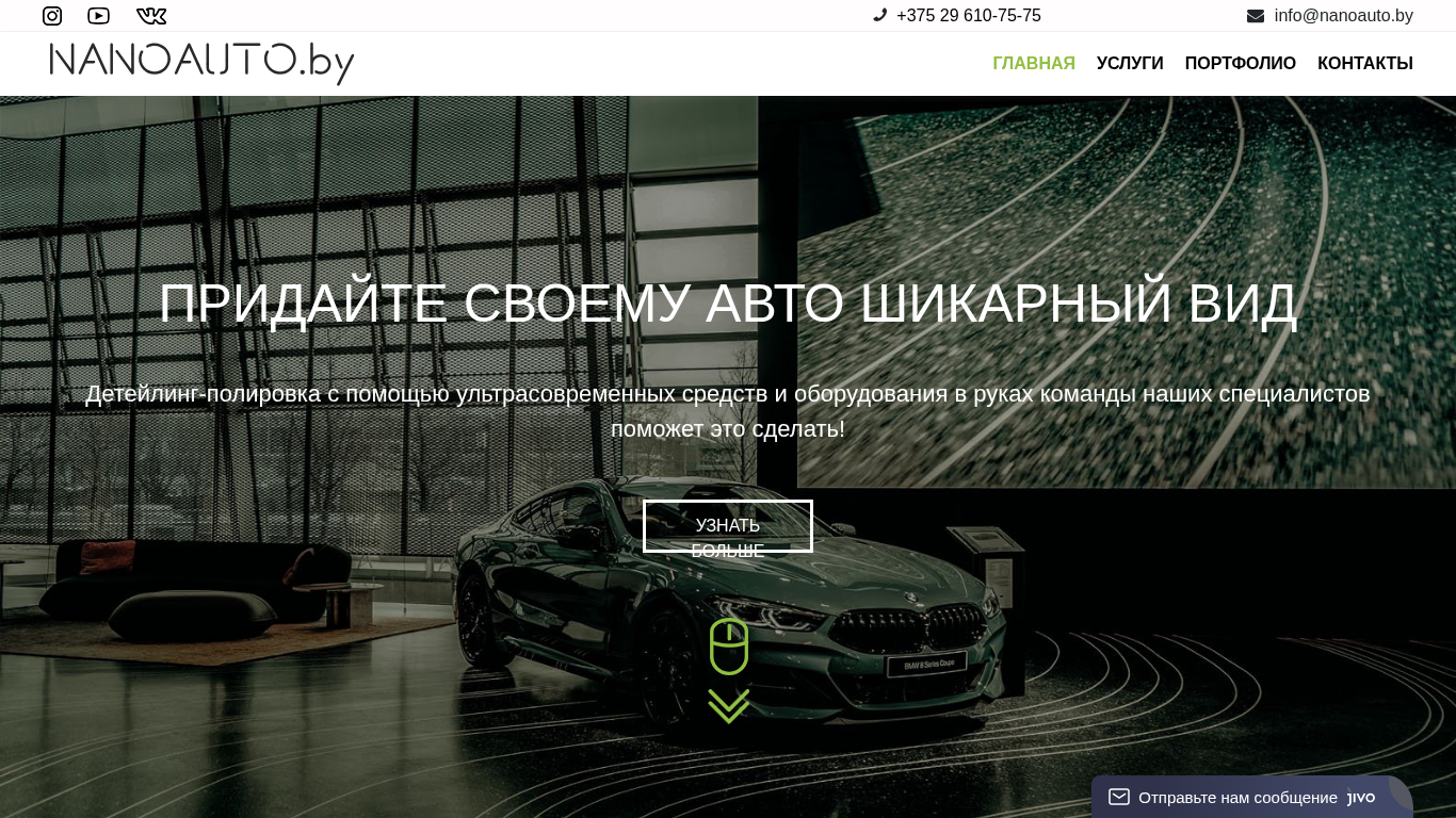 | SEO-описание | Мастера сети салонов детейлинга в Минске Nanoauto, приведут ваш автомобиль к идеальному внешнему виду и техническому состоянию. Обращайтесь. Работаем с любыми автомобилями. |