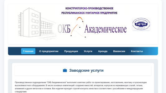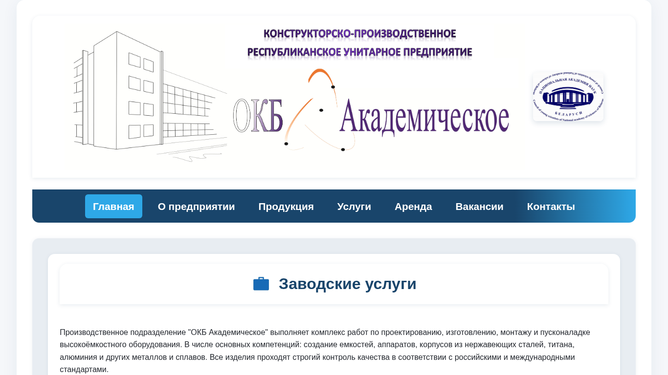 | AI-анализ | This online resource, OKB-ACADEMICHESKOE (okb-acad.by), is a business website dedicated to providing comprehensive services related to the production and sale of high-capacity equipment. The company, "ОКБ Академическое" (OKB Academic), offers a range of competencies including the design, manufacturing, installation, and commissioning of equipment made from various metals and alloys, including steel, titan, and aluminum. All products undergo rigorous quality control in accordance with Russian and international standards. The website also provides information on services for metalworking, offering a production facility, design and technology departments, and a team of experienced engineers. The company specializes in the production of metal tanks, vessels, and equipment for the chemical, oil and gas, and food industries. Additionally, the website offers information on production schedules, contacts, and rental of |