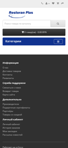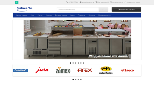 The portal restoran-plus.by is an e-commerce website for the sale of catering equipment. The company has been supplying kitchen technology since 2011 and can provide a wide range of equipment from 35 manufacturers. The website offers a personal cabinet for registration, authorization, saved items, and order placement. Products include coffee machines, ovens, refrigerators, and various kitchen utensils. The site also offers used equipment, information about the company, and a blog. The contact details are provided, including an address, phone number, and working hours. The site is operated on ocStore and is located in Belarus.