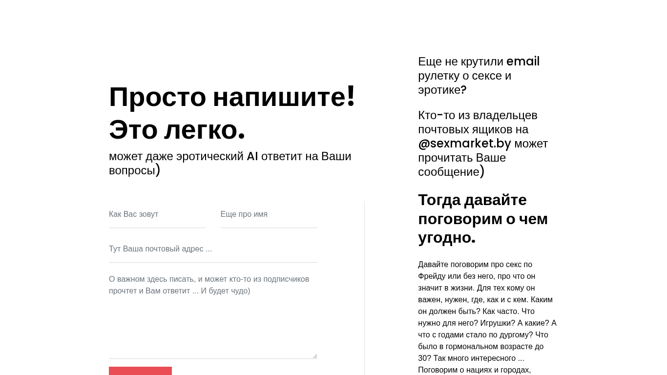| AI-анализ | The web project "В окне общения (In the Window of Communication)" on sexmarket.by is a platform where users can write about various topics, including sex and relationships, using a simple and easy-to-use interface. The project encourages users to ask questions and engage in discussions with others. Keywords associated with the site include 'can', 'your', 'someone', 'let's talk', 'answer', 'message', 'owners', 'mailboxes', 'sexmarket', 'let's', 'about', 'nothing', 'nations', 'cities', 'beautiful places'. The project invites users to discuss topics related to sex and relationships, such as what it means in life, its significance, and how often it is necessary. Users can also ask questions about sex toys and their choices. The site also invites users to share their experiences and discuss other topics. The project |