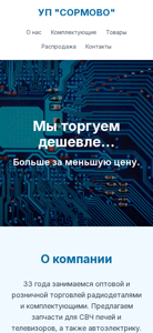 | AI-анализ | --- The web project "УП "СОРМОВО" - Радиодетали и комплектующие" is a thirty-three-year-old business specializing in radio components and spare parts for various devices, including SVCH equipment, televisions, and automotive electronics. The website offers a sale section and is located at 41 Nikiforova Street in Minsk, Belarus. The website's content is primarily focused on providing a catalog of components, featuring sections for fuses, transistors, and other electronic parts. The design includes a hero image and product cards with a checkmark icon indicating availability. The site also features a responsive layout and a scrolling mechanism for easy navigation. Keywords associated with the website include 'price', 'parts', 'sale', 'ruble', 'sormovo', 'components', 'SVCH', 'fuses |