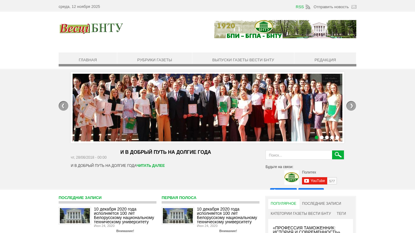 | Название / Заголовок | Вести БНТУ | Вести БНТУ - газета высшего учебного заведения инженерно-технического профиля. БНТУ ведущее учебное заведение Беларуси |