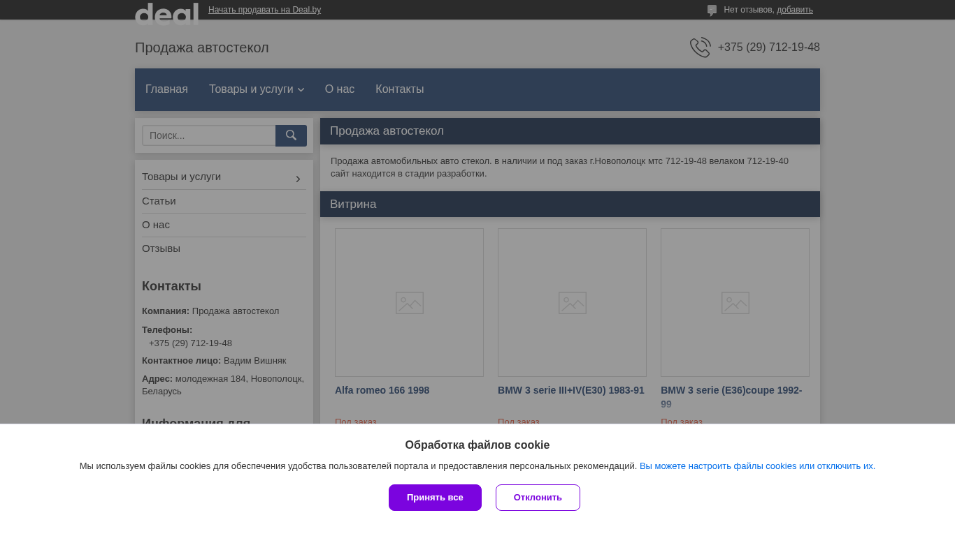 | AI-анализ | The web project "За стеклом.деал.бы" (za-steklom.deal.by) is a sales platform for auto windshields, contact information, products, and services for the company "Продажа автостекол" (Sales of Auto Windshields) located in Novopolotsk, Belarus. The website is under development and includes a list of available auto makes such as Alfa Romeo, BMW, and Citroen with models and prices for windshields, listed under the "Товары и услуги" (Goods and Services) tab. Contact information for the company, including a phone number (+375 (29) 712-19-48), address, and email address are provided on the "Контакты" (Contacts) tab. The website also |