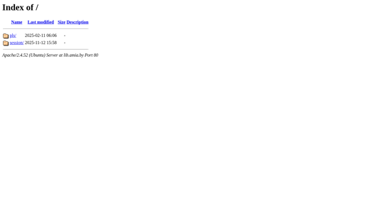 | AI-анализ | This online resource, lib.amia.by, is a web server that runs on Apache 2.4.52 software and is located on Ubuntu operating system. The home page lists files under the directories "pls" and "session", last modified on February 11, 2025, and November 12, 2025, respectively. The size and descriptions of these files are also displayed. The server is accessible on port 80. |