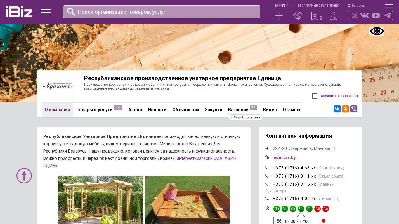 | SEO-описание | Республиканское производственное унитарное предприятие Единица - Производство корпусной и садовой мебели. Плитка тротуарная, бордюрный камень. Доска пола, вагонка. Художественная ковка, металлоконструкции, изготовление нестандартных изделий из металла.. Схема проезда, контактные телефоны, адрес компании Республиканское производственное унитарное предприятие Единица. 222720, Дзержинск, , Минская, 1 |