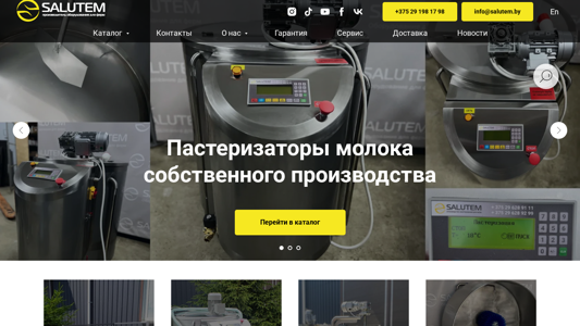 | AI-анализ | This online resource is dedicated to the production of high-quality equipment for the maintenance and milking of calves, as well as equipment for dairy farms. The title is 'SALUTEM — производитель оборудования для молочных ферм' and the description is 'Производство качественной продукции для содержания и выпойки телят, а также оборудования для молочных ферм'. Keywords include 'salutem', 'calves', 'catalog', 'equipment', 'us', 'contacts', '375', 'taxi', 'Minsk', 'salutem', 'equipment', 'warranty', 'service', 'delivery', 'milk'. The top words are 'salutem' (25 times), 'calves' (19), ' |