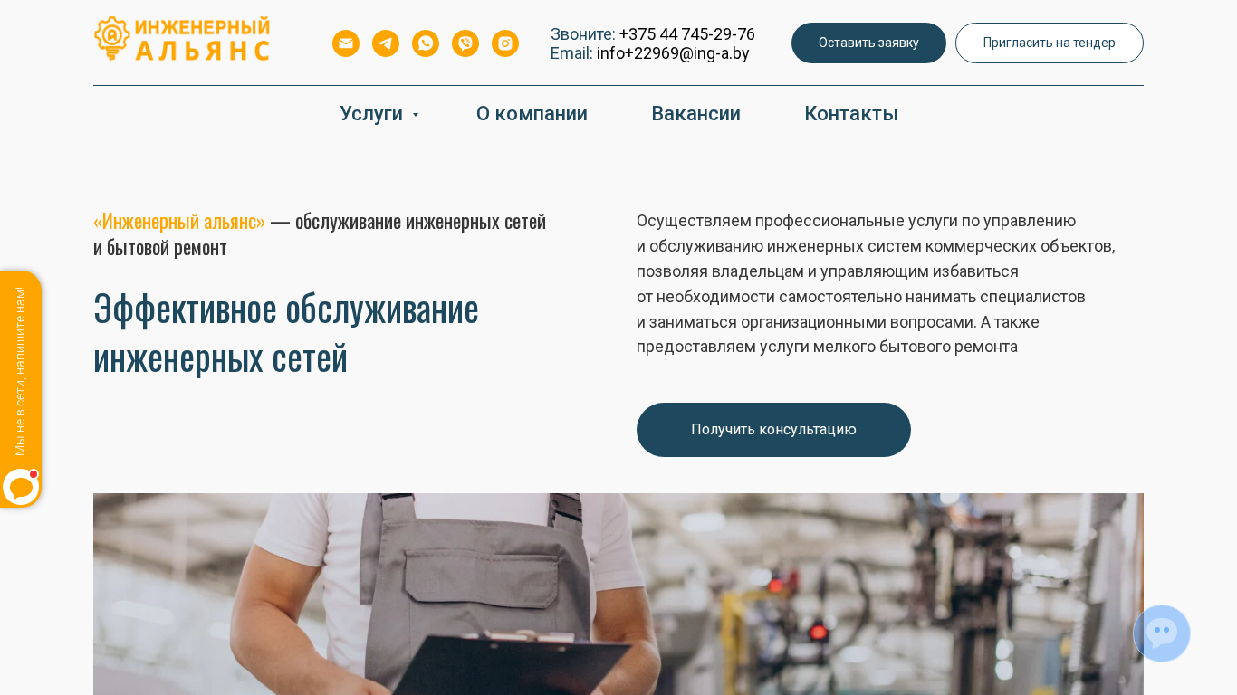 | SEO-описание | Инженерный Альянс предлагает полный комплекс услуг по управлению и техническому обслуживанию инженерных систем коммерческих объектов в Беларуси. Мы обеспечиваем экономию времени и ресурсов, профессионализм, юридическую ответственность и гарантию качества. |
