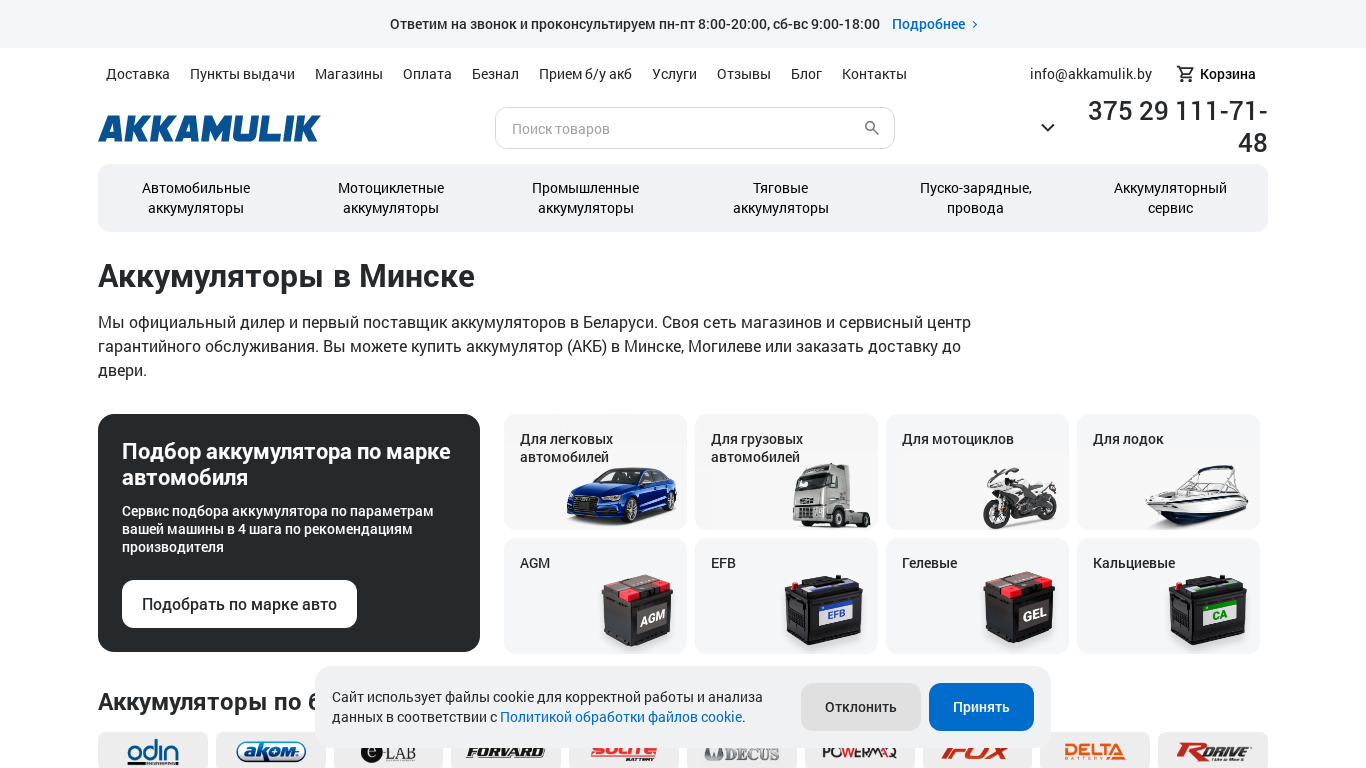 | SEO-описание | Продажа аккумуляторов для автомобиля с доставкой по Беларуси. Купить аккумулятор для авто в Минске. Принимаем старый АКБ в зачет, есть рассрочка. Скидки и акции при покупке. В каталоге более 5000 товаров с фото и отзывами покупателей. Официальная гарантия от производителя и сервисный центр, магазины и пункты выдачи. |