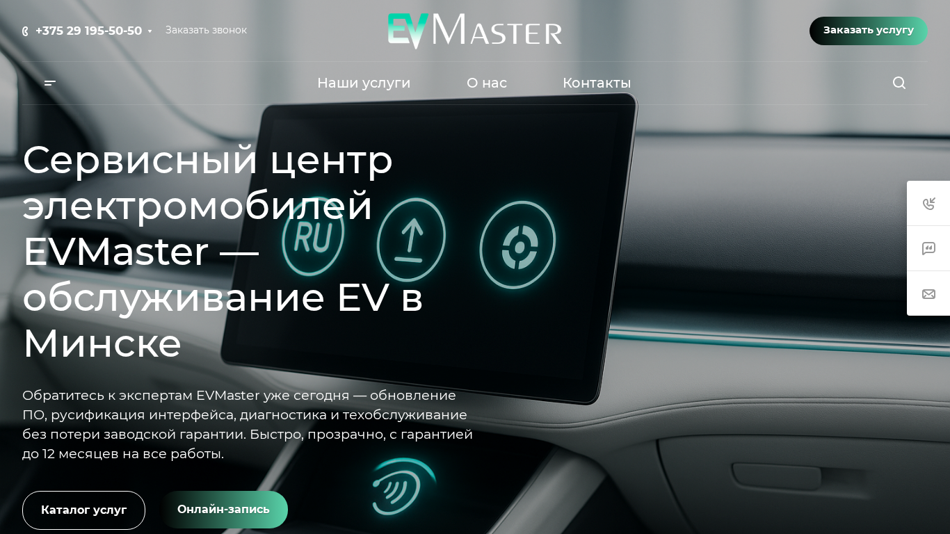 | SEO-описание | EVMaster — профессиональный сервисный центр электромобилей в Минске. Русификация, обновление ПО, диагностика и техобслуживание любой марки. Запишитесь сегодня и доверьте свой электро-авто экспертам! |