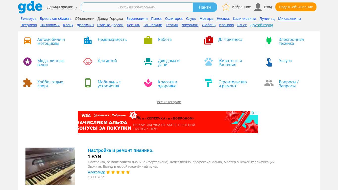| SEO-описание | Gde.by - популярная доска бесплатных частных объявлений Давид-Городка. На нашем сайте Вы найдете актуальные объявления от частных лиц и деловых организаций Давид-Городка. Любой желающий может подать собственное объявление абсолютно бесплатно. |