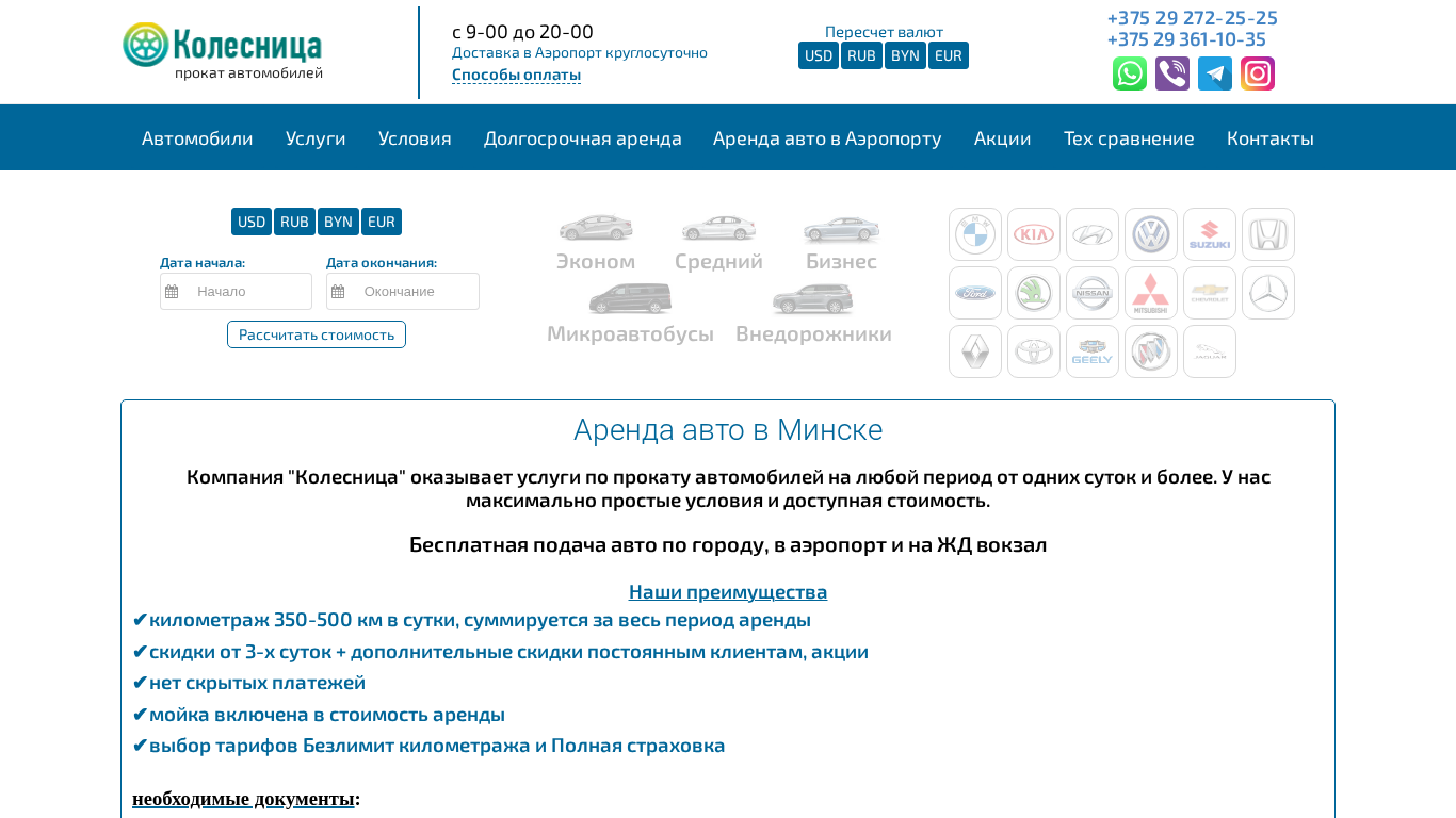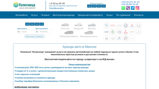 | SEO-описание | Прокат автомобилей в Минске с бесплатной доставкой. Стоимость аренды эконом от 60 BYN, внедорожники от 90 BYN, бизнес-класс от 130 BYN в зависимости от количества суток. |