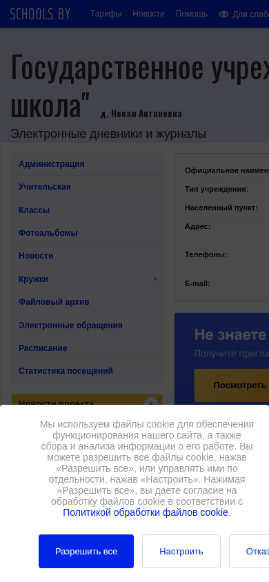 The portal "Antonovskaya Middle School" is an educational institution in Belarus. The website uses cookies for its functionality and data collection and analysis. Visitors can choose to allow all cookies or manage them individually. Functional cookies are required for the site to function properly and cannot be disabled, while statistical cookies are used to improve site performance based on visitor preferences. end of description.