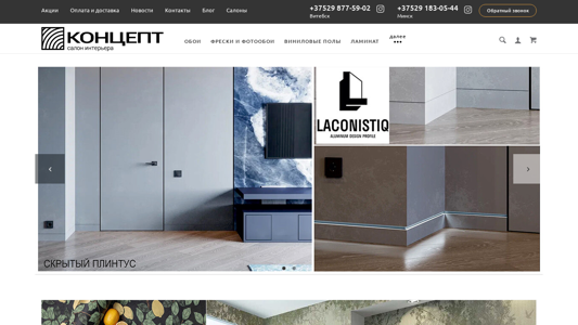 SEO-описание | Интернет-магазин салона интерьера Концепт предлагает огромный выбор отделочных материалов для дома. Только лучшие белорусские, российские и европейские производители обоев, паркета, ламината, плинтуса и др. Факты о нас: большой ассортимент товаров в наличии, салон-шоурум в центре Минска и Витебска, постоянным клиентам скидки до 20%, |