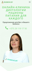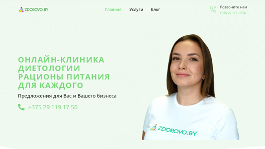 SEO-описаниеОнлайн-клиника диетологии Рационы питания для каждого Предложения для Вас и Вашего бизнеса +375 29 119 17 50 мои услуги Индивидуальные консультации по питанию и корпоративные программы Индивидуальные рационы Меню для клиник и санаториев "под ключ" Консультация по вопросам здорового питания Диетотерапия – это неотъемлемая часть оздоровления, восстановления и лечения. Снижение веса, набор веса, коррекция уровня