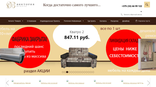| SEO-описание | Интернет-магазин мебели производителя «Виктория Мебель». Низкие цены, большой каталог мебели в Беларуси. |
