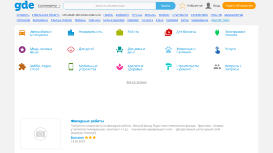 SEO-описание | Gde.by - популярная доска бесплатных частных объявлений Калинковичей. На нашем сайте Вы найдете актуальные объявления от частных лиц и деловых организаций Калинковичей. Любой желающий может подать собственное объявление абсолютно бесплатно. |