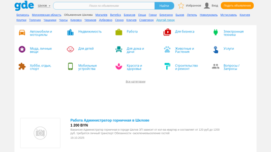 | SEO-описание | Gde.by - популярная доска бесплатных частных объявлений Шклова. На нашем сайте Вы найдете актуальные объявления от частных лиц и деловых организаций Шклова. Любой желающий может подать собственное объявление абсолютно бесплатно. |