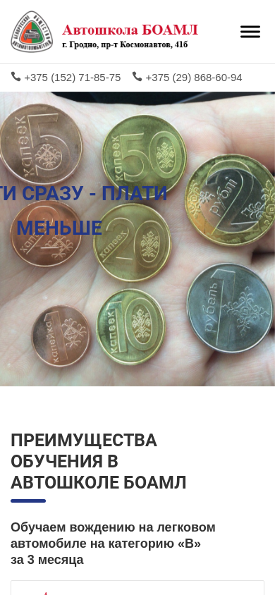 | SEO-описание | Воспользовавшись услугами автошколы БОАМЛ, Вы подготовитесь к тому, чтобы сдать на права в Гродно и получить водительское удостоверение категории B по выгодной цене. Звоните: ☎+375 (29) 868-60-94 |