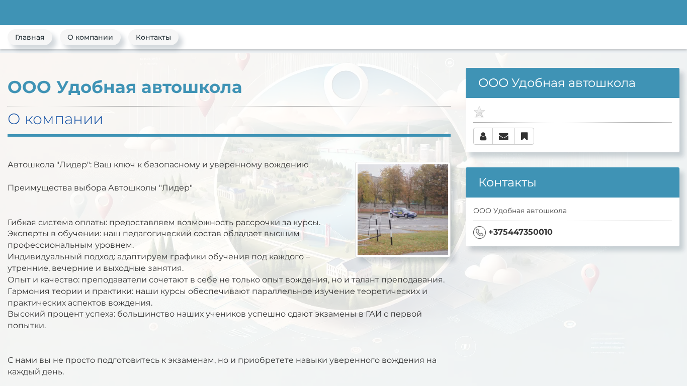 | SEO-описание | ООО Удобная автошкола - Гомельская обл.,г. Гомель,ул. Интендантская, д.1 а, +375447350010 |