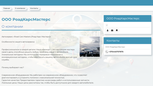 | SEO-описание | ООО РоадКарсМастерс - г. Минск, ул. Передовая, д. 6, корп. 14, оф. 7, +375445757675 |