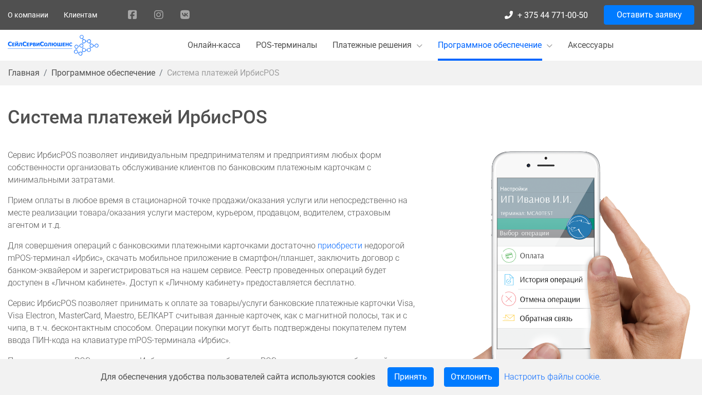 | Название / Заголовок | Система платежей ИрбисPOS, mPOS-терминал "Ирбис" (IrbisPos) — СейлСервиСолюшенс (SaleServiceSolution) |
