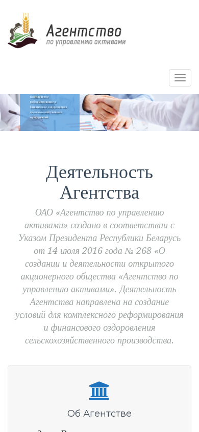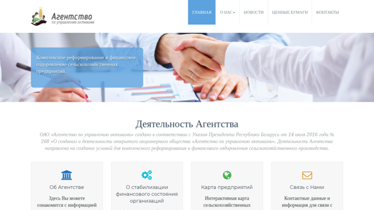 | SEO-описание | ОАО «Агентство по управлению активами» создано в соответствии с Указом Президента Республики Беларусь от 14 июля 2016 года № 268 «О создании и деятельности открытого акционерного общества «Агентство по управлению активами». Деятельность Агентства направлена на создание условий для комплексного реформирования и финансового оздоровления сельскохозяйственного производства. |