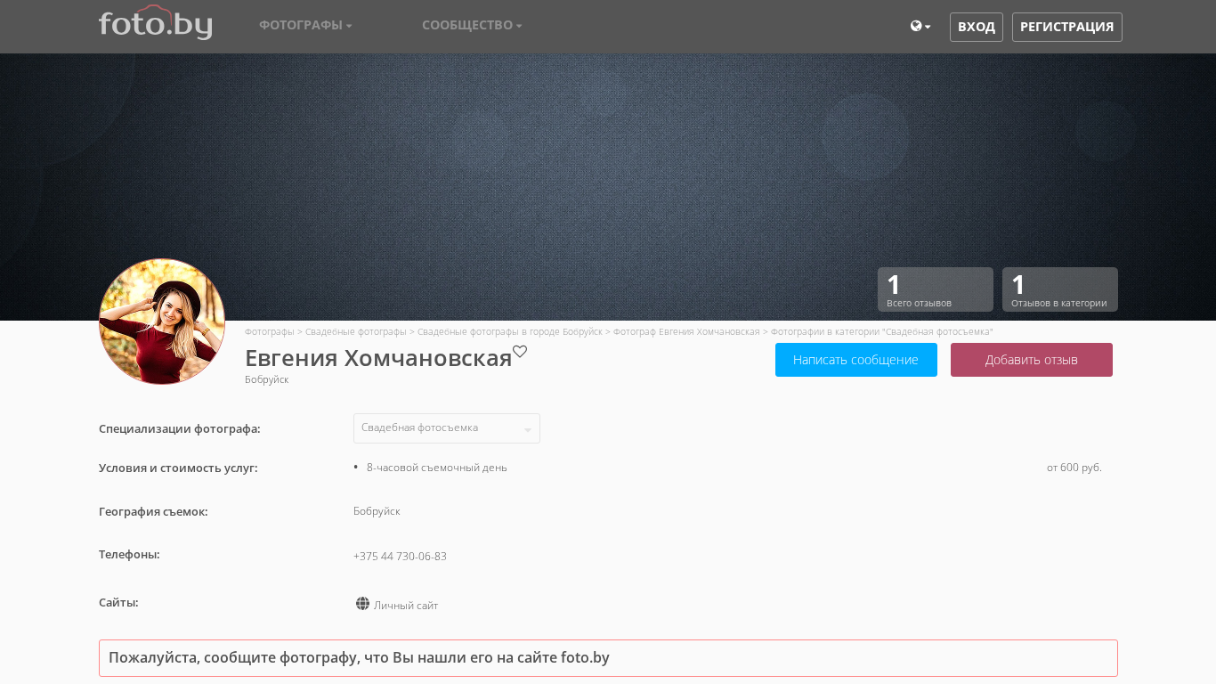 | SEO-описание | Фотографии в категории "Свадебная фотосъемка". Сайт фотографа Евгения Хомчановская. Я работаю как свадебный фотограф в городах Бобруйск |