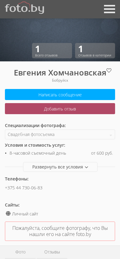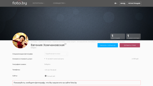 | AI-анализ | This website is a photography portfolio for Evgenia Homchanovskaya, based in Bobruisk, Belarus. The website primarily features photographs in the category "Wedding Photography". The photographer, Evgenia Homchanovskaya, specializes in wedding photography and offers her services in the city of Bobruisk. |