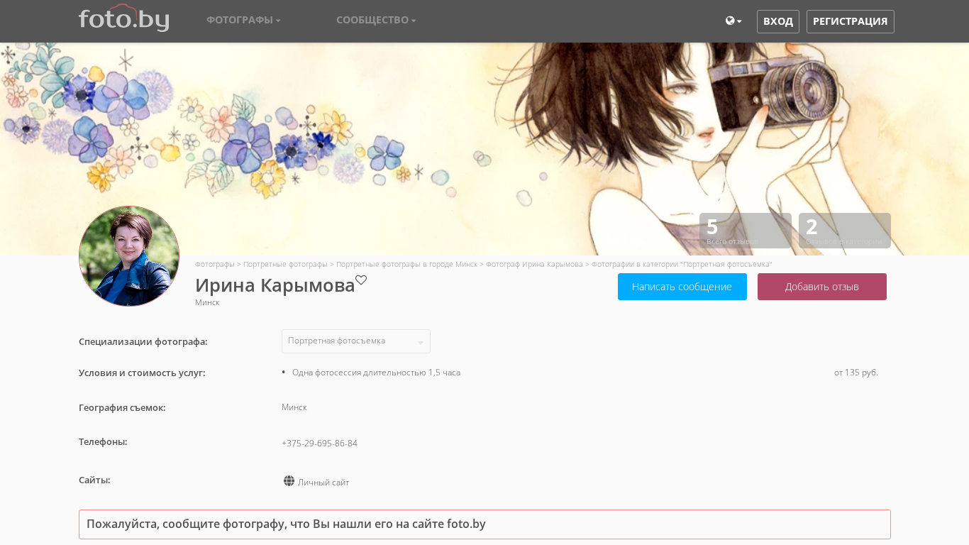 | SEO-описание | Фотографии в категории "Портретная фотосъемка". Фотограф Ирина Карымова - выполняю следующие виды фотосъемок: love story, детская фотосъемка, семейная фотосъемка. Работаю в городах: Минск |