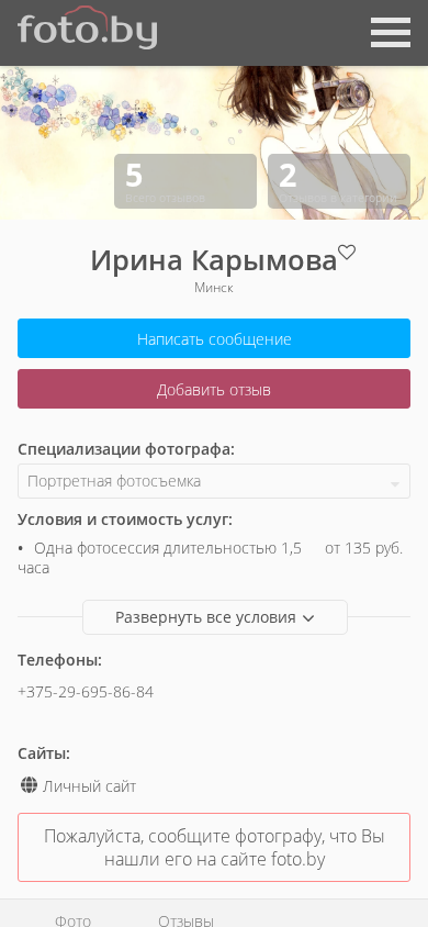 | AI-анализ | The portal is a professional photography website featuring the portfolio of Irina Karymova, a Minsk-based photographer specializing in portrait photography. Visitors can find her works in the "Portrait Photography" category, and she offers various types of photo sessions including love stories, child photography, and family photography. The website also includes a community of photographers and a blog. The main page can display either the catalog of photographers or the community of photographers. Irina Karymova's contact information includes a phone number and a personal website. She has received 5 reviews in total, all in the "Portrait Photography" category. Her services are available in Minsk and pricing starts from 135 rubles for a 1.5-hour session. |