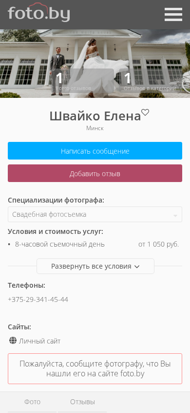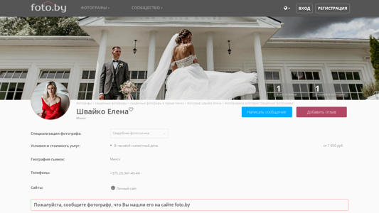 | AI-анализ | --- This website is a photography portfolio by Elena Shvayko, a wedding photographer based in Minsk, Belarus. The website's main category is 'Wedding Photography'. Elena specializes in 'Love Story' sessions in addition to wedding photography. Her services are available in Minsk. The website features a community for photographers and an option for users to leave reviews. The main page displays the catalog of photographers, with Elena Shvayko's portfolio being one of them. Users can also find her contact information on the site. |