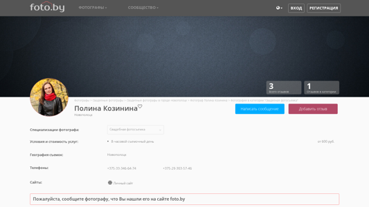 | AI-анализ | This online resource is a photography website belonging to photographer Polina Kosinina, based in Novopolotsk, Belarus. The website primarily showcases Polina's work in the "Свадебная фотосъемка" (Wedding Photography) category, but she also offers services for "детская фотосъемка" (Child Photography) and "портретная фотосъемка" (Portrait Photography). Users can find her work in the "Фотографы" (Photographers) section of the main catalog. The website includes a community section for photographers, as well as a blog and a search function. The homepage can be set to display the photographers' catalog or the photographers' community. Polina's contact information includes two phone numbers: +375-33-34 |