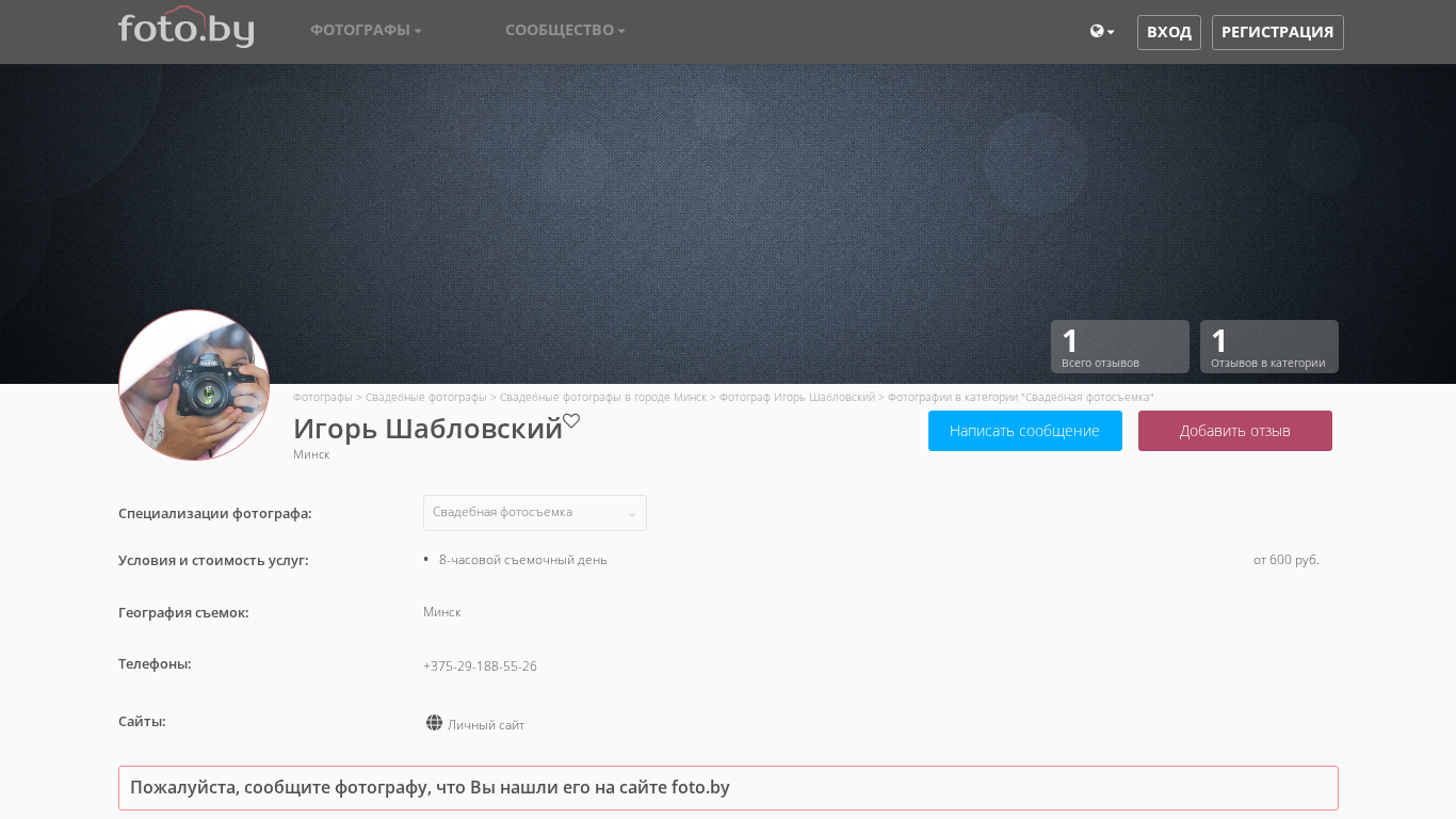 | AI-анализ | --- The web project "Shabliv.foto.by" is dedicated to the work of photographer Igor Shablovsky from Minsk, Belarus. The website features a category for "Wedding Photography" and the photographer specializes in various types of photo sessions including love stories, children photography, and weddings. He serves clients in cities such as Minsk, Vitsebsk, and Grodno. The site includes a catalog of photographers, community for photographers, and a blog. The site was visited on August 23, 2018 and has one review in the wedding photography category. The photographer offers an 8-hour photo shoot starting at 600 rubles. |