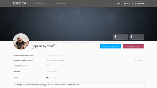 | AI-анализ | The web project "Foto Graff by Serghei Bugaez, Wedding Photographer in Minsk" specializes in wedding photography under the category "Свадебная фоtoсъемка". The photographer, Serghei Bugaez, offers the following types of photo shoots: love story and wedding photography. He covers the cities of Minsk, Mogilev, and Grodno. The website features a community of photographers with various categories, including automobile photography, animal photography, architecture, and more. Visitors can find reviews of photographers and their portfolios. The site offers a personal site for Serghei Bugaez, where interested parties can write a message, add a review, and view his portfolio. The site is available in both Russian and Belarusian languages. The site was visited on July 30, 201 |