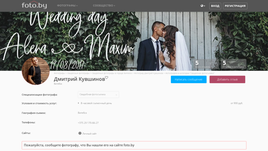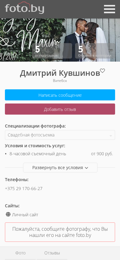 | AI-анализ | The portal is a photography website of Dmitry Kuvshinov, a wedding photographer based in Vitsebsk, Belarus. The site features a category of wedding photography. The website includes a catalog of photographers, a community of photographers, and various categories such as automobile photography, photography for children, and interior photography among others. The homepage allows users to toggle between the catalog of photographers and the community of photographers as the main page. The photographer Dmitry Kuvshinov specializes in wedding photography and offers an 8-hour shooting day for 900 rubles in Vitsebsk. The site also includes a blog, announcements, and a contact page. Users can write messages and leave reviews for the photographer. |