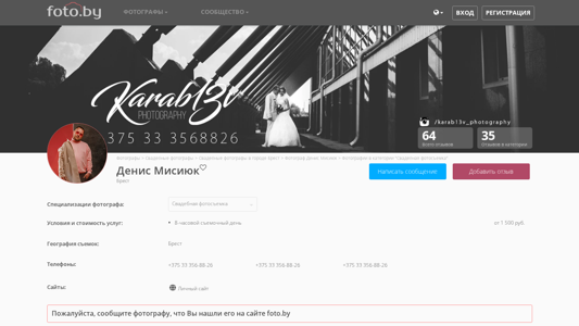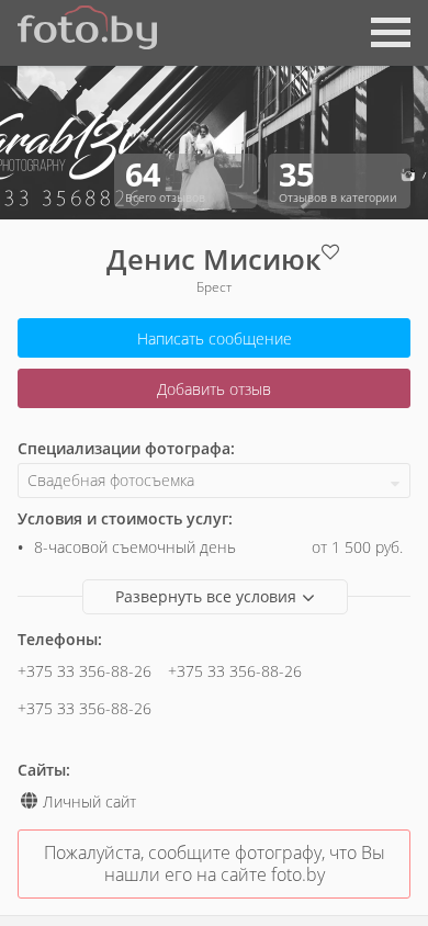 | AI-анализ | The website is a photography portfolio for Denis Misiuuk, a photographer based in Brest, Belarus. The website primarily showcases his work in the category of "Свадебная фотосъемка" (wedding photography). Denis offers his services in all cities of Belarus and the CIS. The site also includes a community section for photographers and various other categories for photography services. The website received 35 reviews and 64 total reviews in the "фотографы" category, with Denis Misiuuk having 12 listings, all in the "Свадебные фотографы" and "Свадебные фотографы в городе Брест" subcategories. The site includes information about Denis's specialties, pricing, and contact details. |